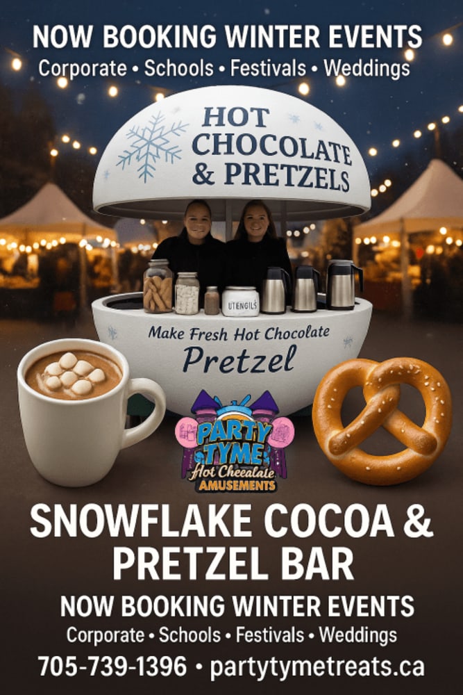 Bring cozy vibes to your winter event with our one-of-a-kind Snowflake Cocoa & Pretzel Bar. The cart looks amazing on site and serves rich, gourmet hot chocolate with a toppings bar plus fresh, hot pretzels—perfect for festivals, schools, corporate events, and weddings.